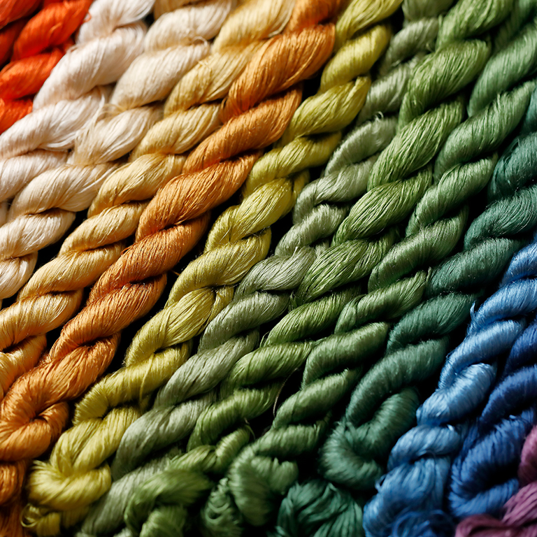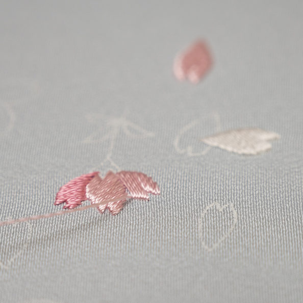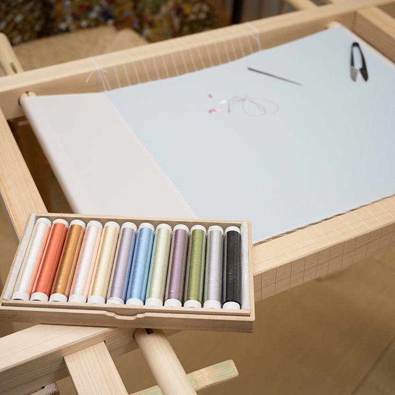 刺繡に使用する絹糸は8000もの色が存在します。その中より図案似合う色を選びとり、職人が1本ずつ手で縒って、表現に合う糸をつくりあげます。この縒り糸のバリエーションが多く表現が豊かなことが長艸の刺繡の特徴です。