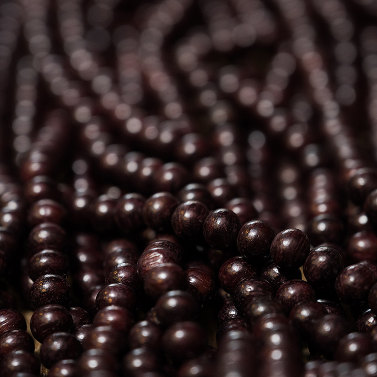 ローズウッドとも呼ばれる紫檀はヤニを多く含むため耐候性があり、腐敗せず長持ちすることから仏壇や家具、唐木細工や楽器などに使用されてきました。しかしながらワシントン条約の制定で輸入の制限を受け、入手困難になってしまった紫檀。中野伊助ではかねてから入手していた貴重な紫檀の在庫を用いて、京念珠の製作を行っています。