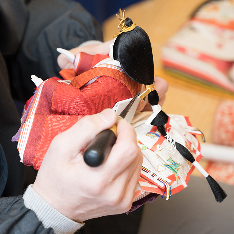 「京人形 み彌け」にて受け継がれる貴重な技法に習い、京都選りすぐりの素材に触れながら制作する「ひな人形」。