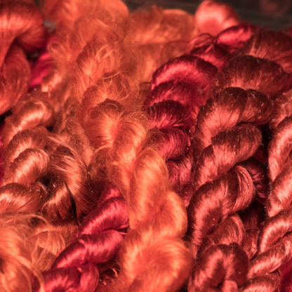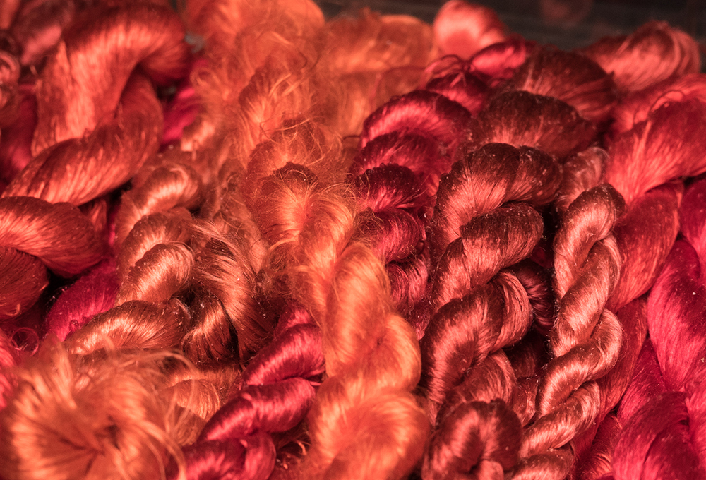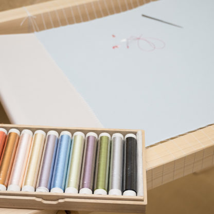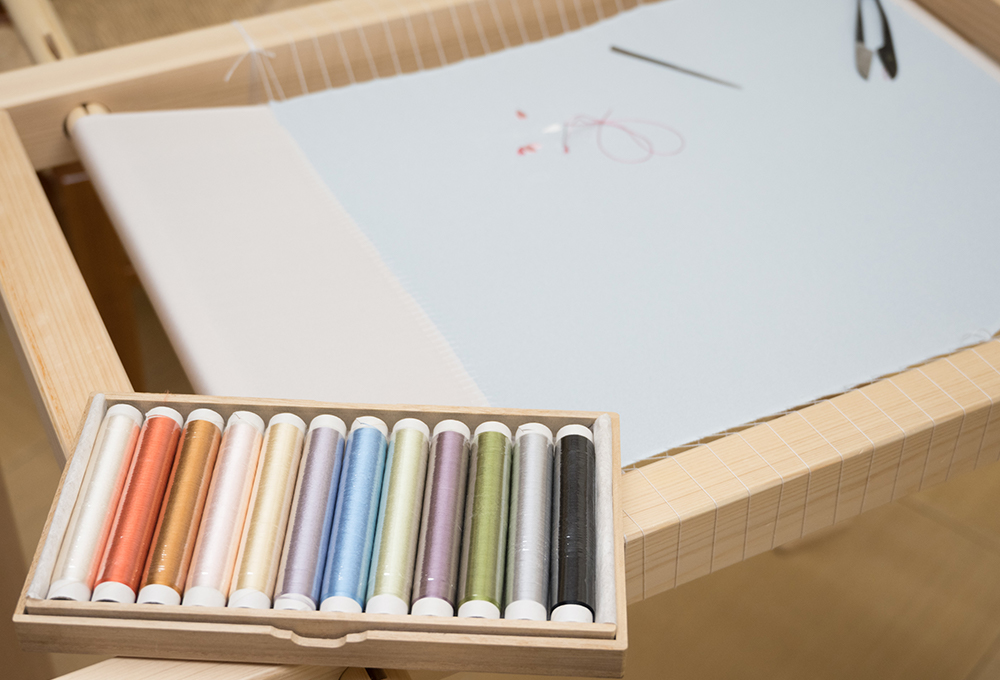 その中より図案似合う色を選びとり、職人が1本ずつ手で縒って、表現に合う糸をつくりあげます。