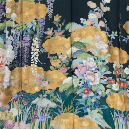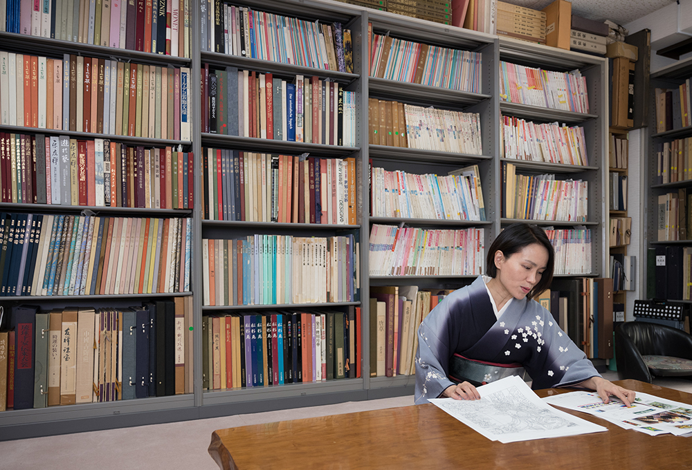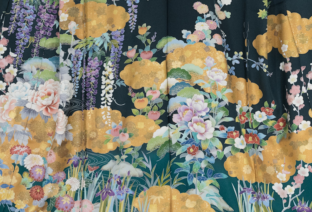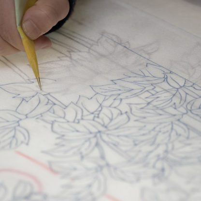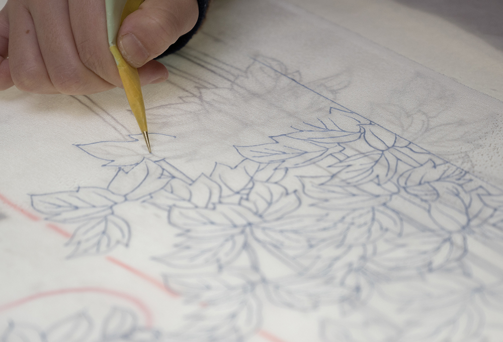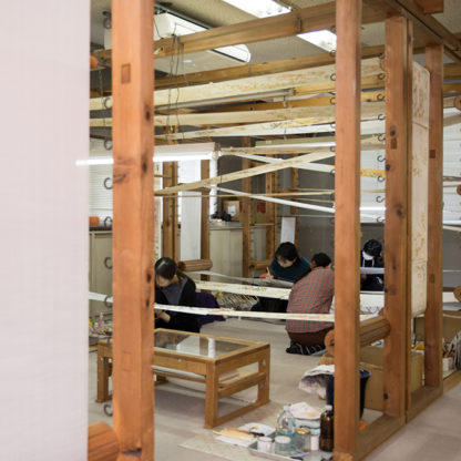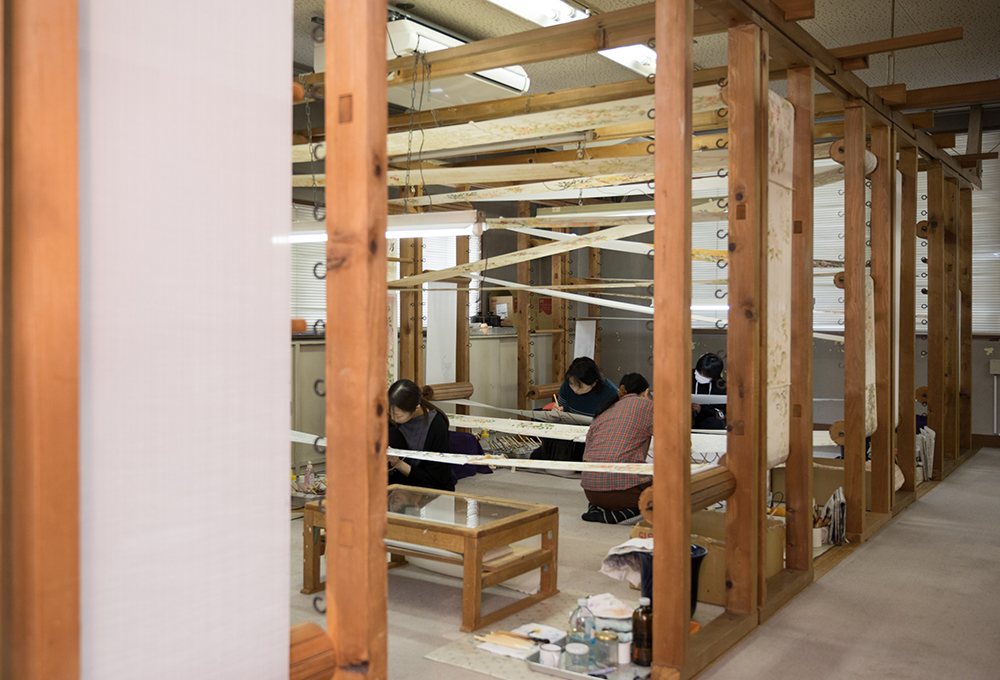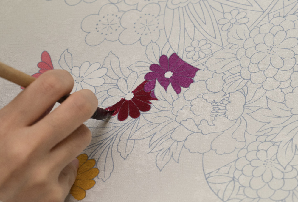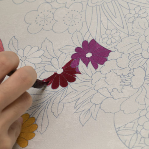 手描き京友禅 岡山工芸で、職人が本番で用いる幅の生地を使って京友禅の工程を体験することができます。