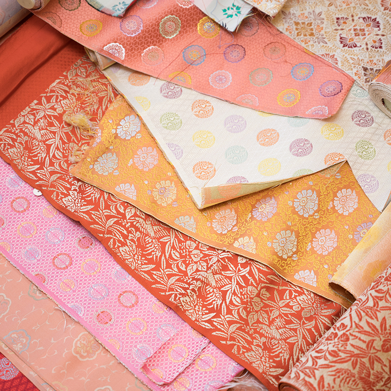 まずは衣装の生地を選びます。京都の生地屋さんから特別に仕入れている、人形のサイズに合わせて小さ目に模様が織られた特製の布地を使用。現代の感覚でも愛されるようなシンプルな色味や可愛らしい柄物、歴史ある文様が織られたものなど、十数種類から選んでいただくことが可能です。