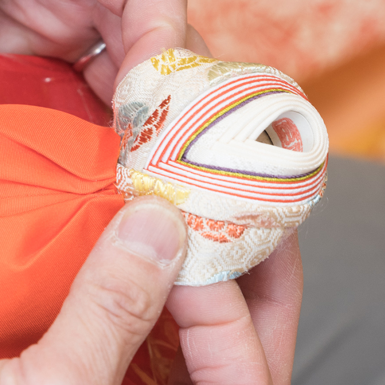 最後に目打ちを使って、「かいな折り」と呼ばれるお雛様の腕の振りつけ作業をします。腕の位置をおさめるのは、プロの職人でも難しいとされている作業。慎重に行い、雛人形の完成です。