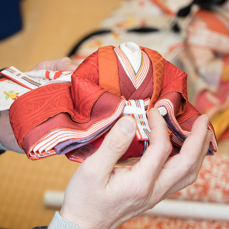 選んでいただいた生地で誂えた着物を胴体に着せていきます。糊はうなじと衿元にしかつけないので、それ以外は本物の着付け同様、お雛様に着付けていきます。今まで別々に制作されてきた胴体、衣装、手足、お顔、小道具がこの時点で一体となります。