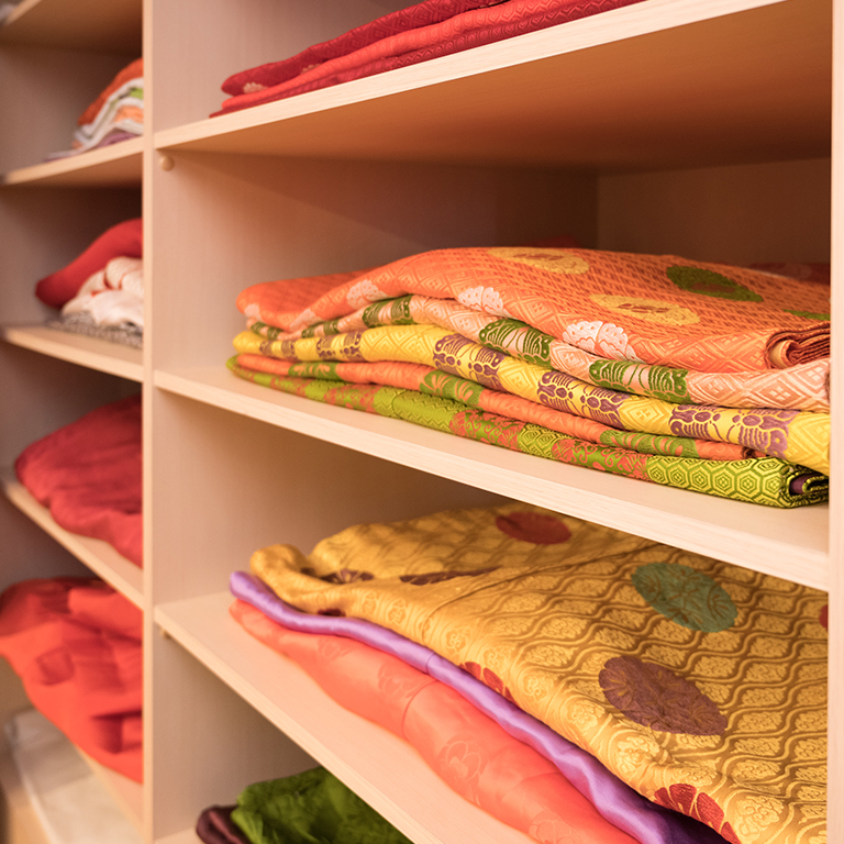 80余年装束店を営む『平安荘苑株式会社』のもと、JR東海主催の十二単着付け体験と講演がきっかけとなり、1998年に『平安装束体験所』を開設。2013年に「株式会社弥栄(いやさか)」として独立しました。弥栄には「生きとし生けるもの全てが栄えますように」という意味が込められているそうです。そうした意味合いを踏まえ、弥栄の衣装には「お召しいただく皆様が栄えますように」との想いが込められ、平安人が繁栄や長命を願い着用した色目や文様が用いられています。また、同社では伝統に裏打ちされた宮中における制作技術を踏まえつつ、独自にアレンジを加えた十二単の制作も手掛けています。