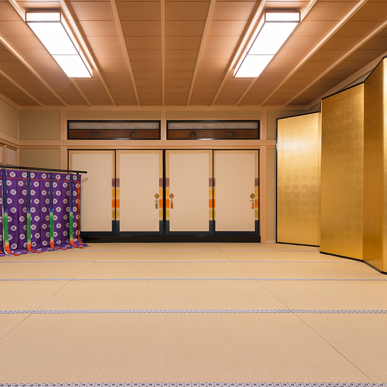 こうした本格的な十二単の着装体験・記念撮影を手がけている同社。撮影は一日あたり午前・午後のニ組限定で、ゆったりとした雰囲気の中、まるで平安『源氏物語』の世界へとタイムスリップしたかのような非日常感を楽しむことができます。撮影に利用する座敷は15畳の広さで天井も高く、立ち姿も撮影可能。座敷内の畳は高麗縁の小紋で、平安時代の貴族が用いていたものを使用しています。さらに平安時代の貴族がお目出たいお祝いの際に用いた美麗几帳を使用して、雅やかな撮影をお楽しみください。金屏風の前では皇室の婚礼と同様の撮影も行う事が出来ます。