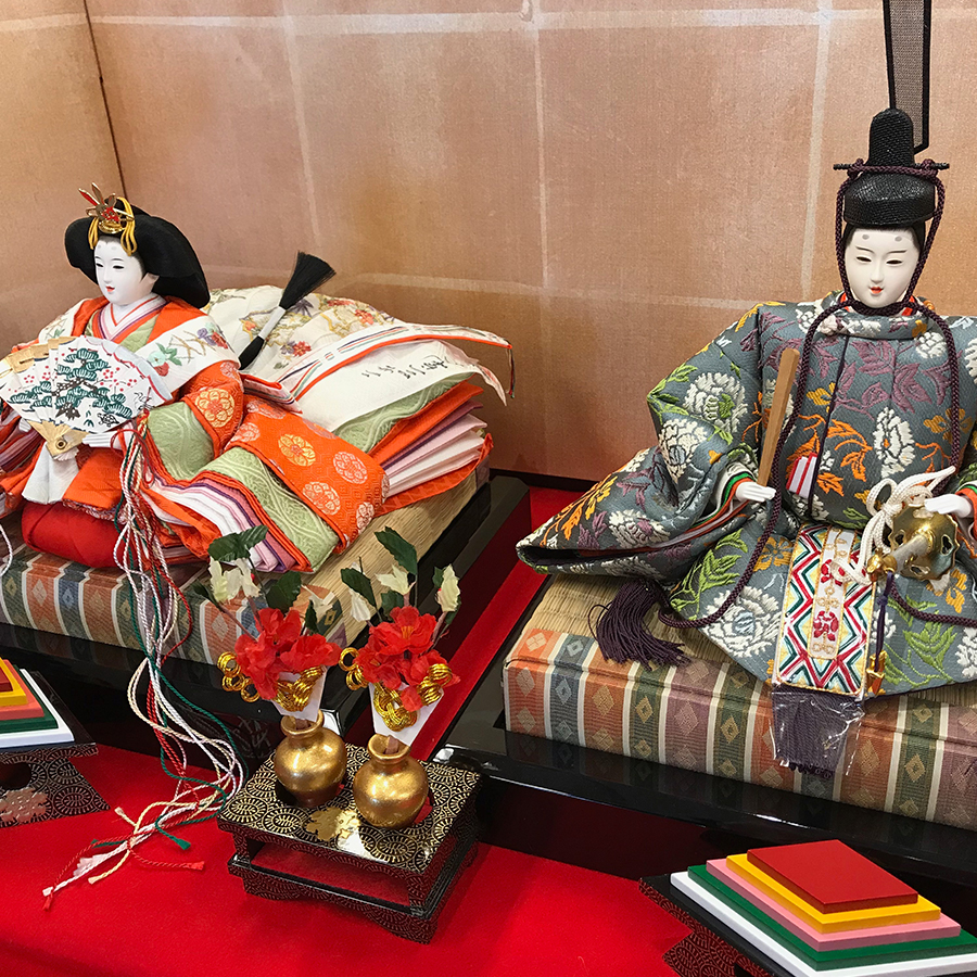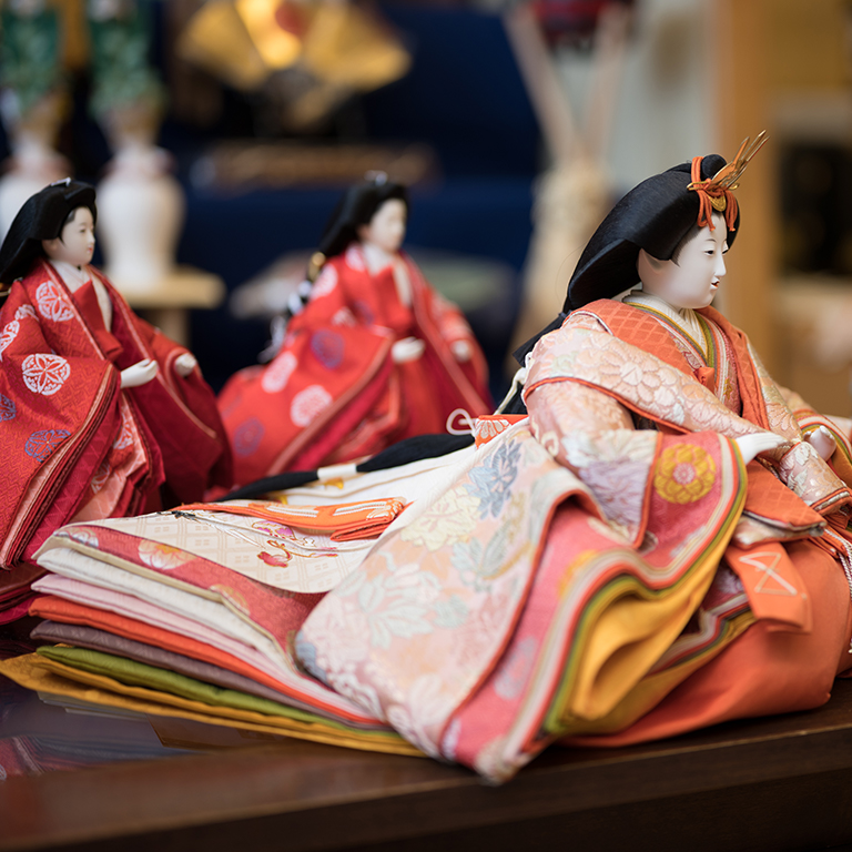 古来より人々に幸せをもたらす力があるとされてきた人形。‟人形(ひとがた)“と呼ばれる木や紙でできた人形を海や川に流した行事と、平安時代の‟ひいな遊び”と呼ばれる人形遊びが江戸時代に合体して、“ひな祭り”として祝われるようになったと言われています。雛人形は子どものお守りとして、「愛しいわが子が丈夫に育ってくれるように」との愛情を込めて、親から子へと贈られてきました。雛人形は節分(ニ月三日)から桃の節句(三月三日)まで飾られることが一般的とされていますが、旧暦の節句(四月三日)まで飾る地域もあります。旧暦に合わせて飾るとニヶ月間に渡って華やかな雛飾りを楽しむことができます。また、日本では「三月三日までに雛人形を片付けないとお嫁に行くのが遅れる」などと言われることもありますが、これは日ごろの整理整頓に対する意識を促すため。「ずぼらにならず、きちんとした女性に育つように」との想いが込められたものだそうです。教訓は胸に刻みつつ、技巧の光るお雛様を心行くまで堪能しましょう。