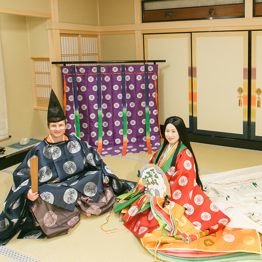 「十二単記念撮影館 雪月花苑」では、本物の平安装束を身にまとった撮影体験をお楽しみいただけます。