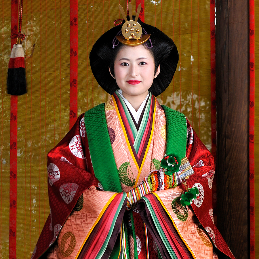 「唐衣(からぎぬ)」「表着(うはぎ)」「打衣(うちぎぬ)」「五衣(いつつぎぬ)」「単衣(ひとえ)」「長袴(ながばかま)」「裳(も)」からなる装束の色や柄を、お好みでお選びいただけます。