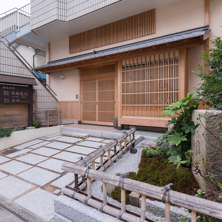 京都・御所南の地で神社調度品、神官装束の製造・販売をする装束店として昭和4年に創業した『平安装苑株式会社』より、2003年に十二単専門店として独立した『株式会社弥栄』。2017年には現在の伏見の地へ移り、平安装束に特化した日本で唯一の十二単記念撮影施設を開設しました。『雪月花苑』という屋号は、先代より交流のある日本を代表する書道家、杭迫柏樹先生の石碑に由来して命名されたもの。店内には京町屋の雰囲気を残しつつも最新撮影設備機器が設置され、海外からのVIPや国内外の要人にも恥ずかしくない環境で記念撮影を行うことができます。