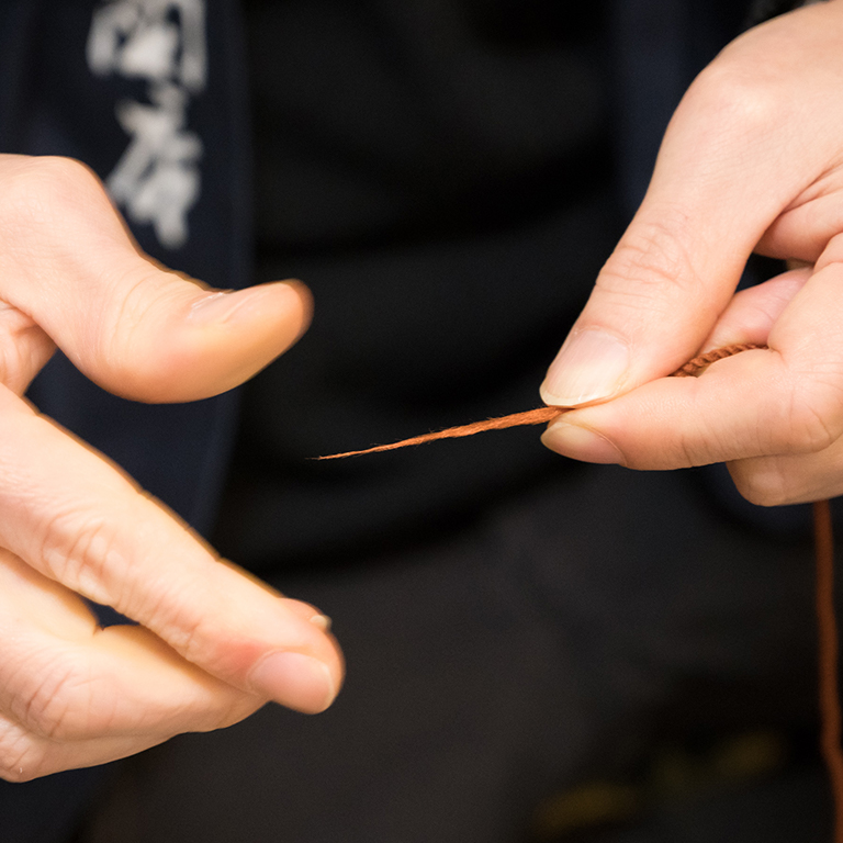 紐は京都・西陣の紐屋さんから仕入れているもので、当日は紐の色を選んでいただくことも可能です。紐自体が2色の組み合わせでできているので、その表情の違いにご注目ください。次に、完成したこよりの先に先糸を付けます。木綿の糸でしっかりと結び付けていきましょう。