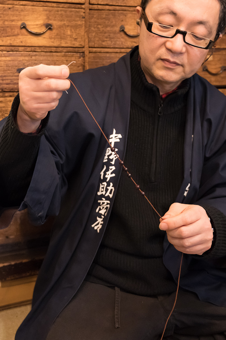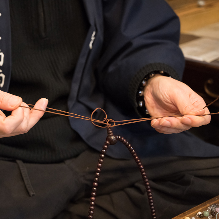 中野伊助の念珠製作のこだわりは仕上げ作業。同じ材質の珠を用いても、紐を通す穴の部分を丸めず尖ったまま使ったり、穴の中を磨かずにザラザラの状態のまま使ったりすると、摩擦で紐がすぐに切れてしまうそう。そういった細部にまでこだわりが見られる職人の技が、丁寧に随所に施されています。